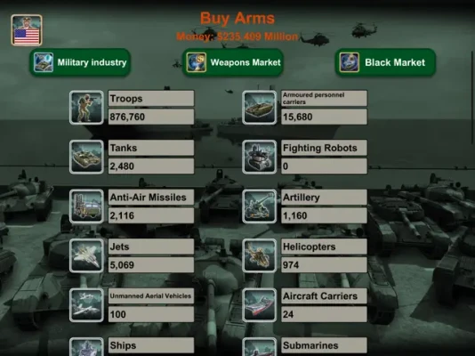 Arm yourself with an arsenal of weaponry, including Mercenaries, Armored Personnel Carriers (APCs), Tanks, Artillery, Anti-Air Missiles, Helicopters, Fighter Jets, Ships, Submarines, Fighting Robots, Unmanned Aerial Vehicles (UAVs), Aircraft Carriers, and Ballistic missiles.