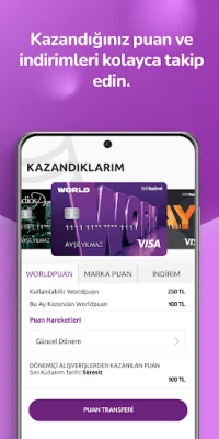 Kazandıklarım menüsünden kredi kartlarınızla yaptığınız işlemlerinizi ve kampanyalardan kazandığınız, harcadığınız ve kullanılabilir puanlarınızı ve kazandığınız indirimlerinizi görüntüleyebilir, kartlarınız arası puan transferi yapabilirsiniz.