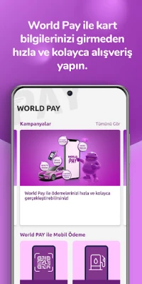 World PAY menüsünden QR Kod ile Ödeme özelliği sayesinde ödeme yapacağınız kartınızı veya hesabınızı seçtikten sonra alışverişinizi tamamlayabilirsiniz. NFC Mobil Ödeme özelliği sayesinde cihazınızı temassız POS’a yaklaştırarak alışverişinizi gerçekleştirebilirsiniz. Üstelik 750 TL ve altı temassız işlemlerinizi şifreye ve imzaya gerek duymadan tamamlayabilirsiniz. Araçta Ödeme özelliği sayesinde Opet istasyonlarında ödemenizi aracınızdan inmeden gerçekleştirebilirsiniz.
