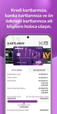Kartlarım menüsünden Yapı Kredi kredi kartlarınıza ait limit, borç, hesap kesim tarihi, banka kartlarına ait bakiye, IBAN numarası ve daha birçok bilgiye erişebilirsiniz. Kartlarınıza ait işlemlerinizi inceleyebilir, limit artırma, harcama erteleme, kart şifresi belirleme gibi işlemlerinizi gerçekleştirebilirsiniz.