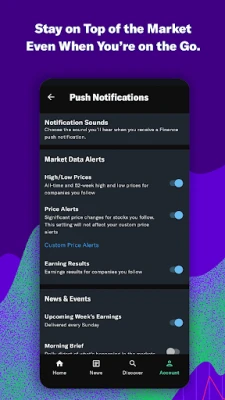 • Enable notifications for price alerts, breaking news, earnings reports, and more