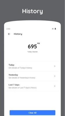 ✓ Analyze app's cache ✓ Clear cache of apps either manually or automatically ✓ History ✓ Detailed history ✓ Floating dock for easy launch